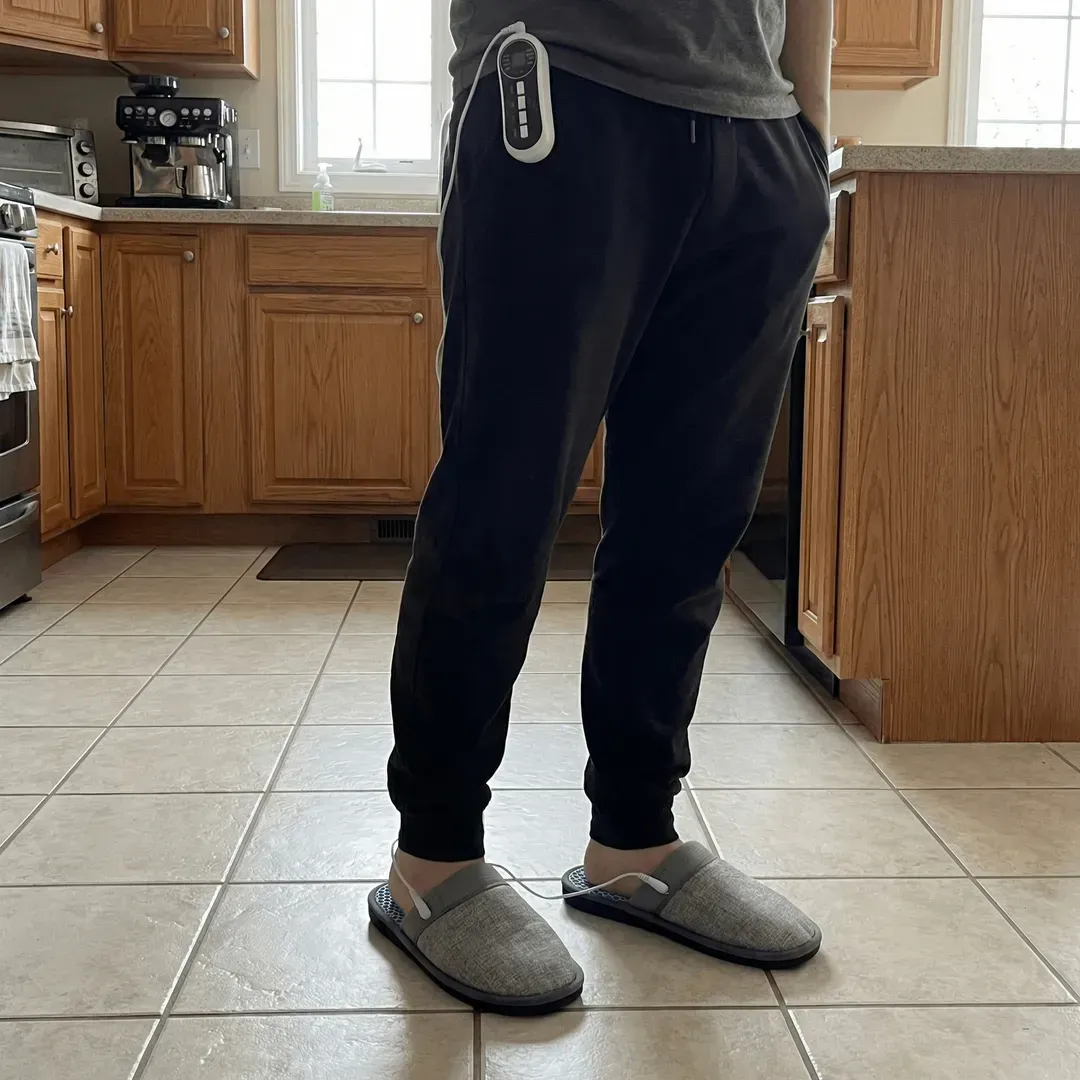 Place your feet inside the Neurode Massage Shoes. Ensure your soles are in direct contact with the EMS electrode pads for targeted acupressure activation.
