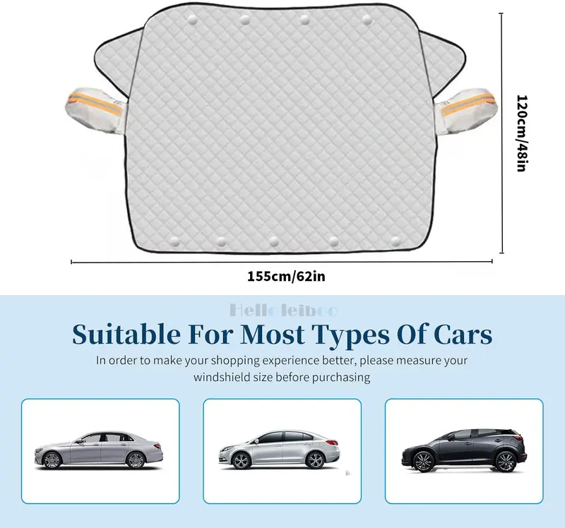 Standard Size:Fit for Most Vehicles: (63” L * 46 W ). Perfectly covers the entire front window, suitable for most of vehicles and standard SUV. The car snow cover is designed long enough to cover entire windshield and Wiper Blade.