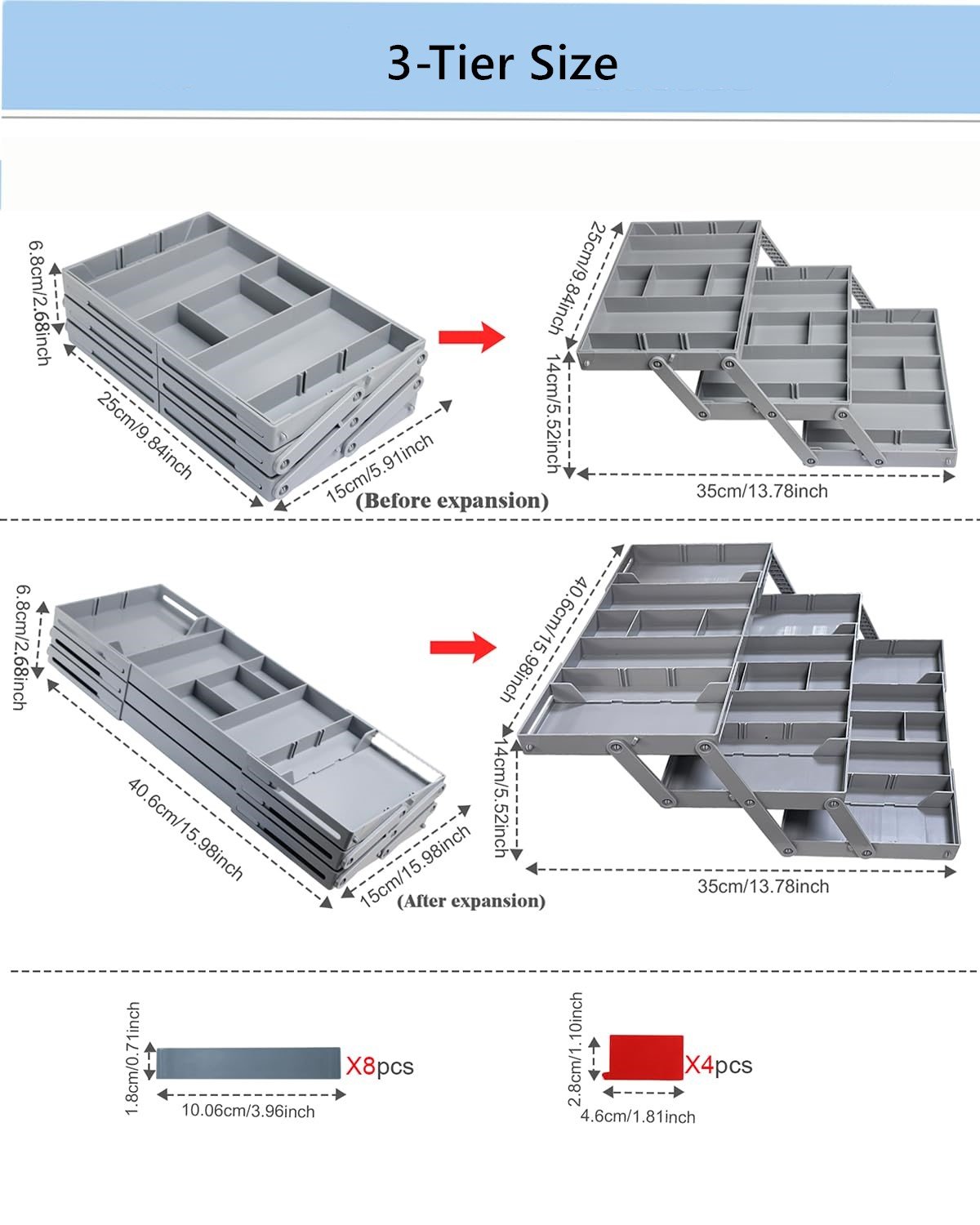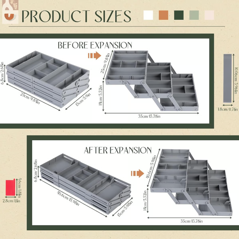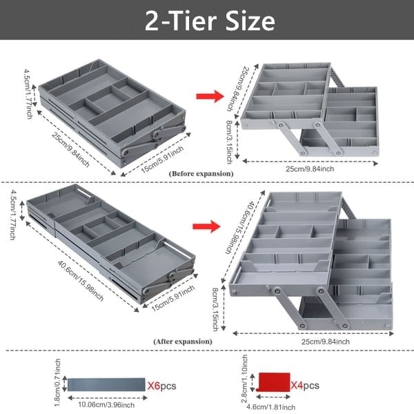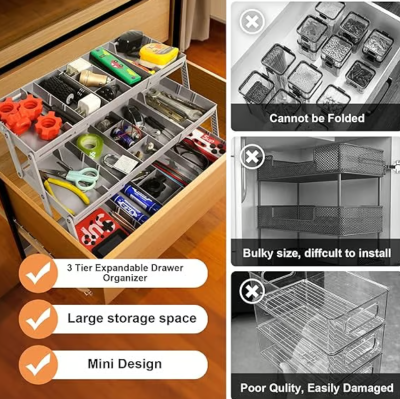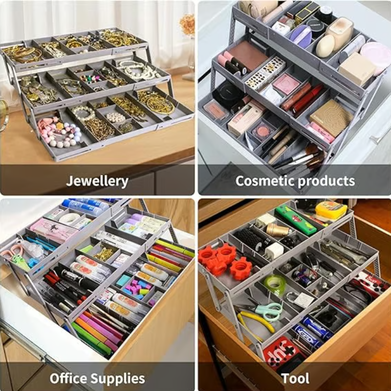 Custom Storage Triples Drawer Space: Maximize drawer storage space with this 3-tier expandable drawer organizer. The 12 dividers can adjusted or removed as needed. At 2.65 inches high, this collapsible storage organizer fits most standard drawers