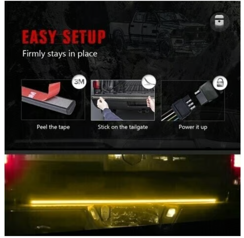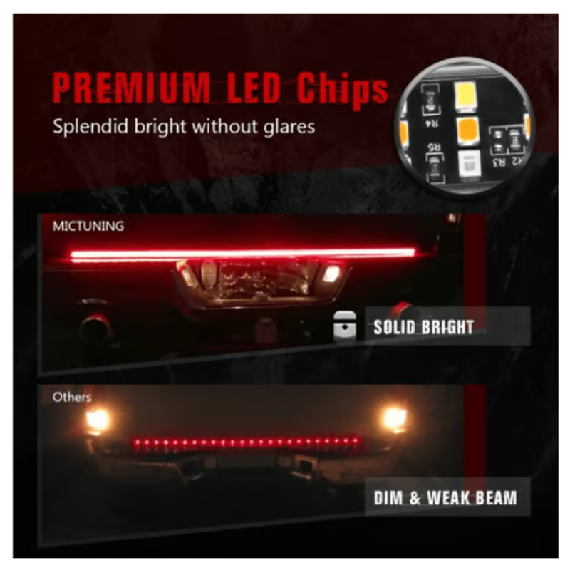 FULL FUNCTIONS - Features full functions of brake, turn signal, running, reverse and strobe light. The Triple-row tailgate light emits low Red for running, Bright Red for braking, Amber for left/right turning signals, White for reversing, and Flash Amber for emergency strobe light. Let everyone behind you clearly knows what's your next step!