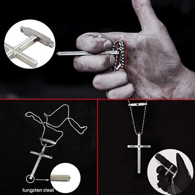 ★ Self-Defence Cross Necklace — More than just a symbolic cross pendant, this is an original EDC emergency rescue tool. It serves as a powerful personal defence weapon against attackers and an emergency safety hammer for vehicle escape.